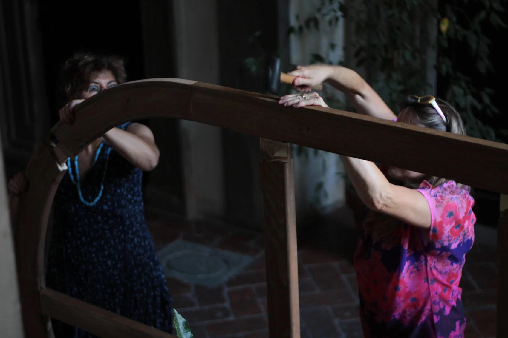 La prova che la conservazione è una questione di mente... e muscoli. Le restauratrici Elizabeth Wicks e Nicoletta Fontani creano un supporto su misura per un dipinto restaurato di Violante Siries. (Foto: F. Cacchiani)
